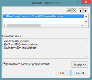 这里可以添加任意多个目录,IDE会从这些目录里寻找头文件。所以只要你将GLFW的Include文件夹加进路径中,你就可以使用<GLFW/..>来引用头文件。库文件夹也是一样的。