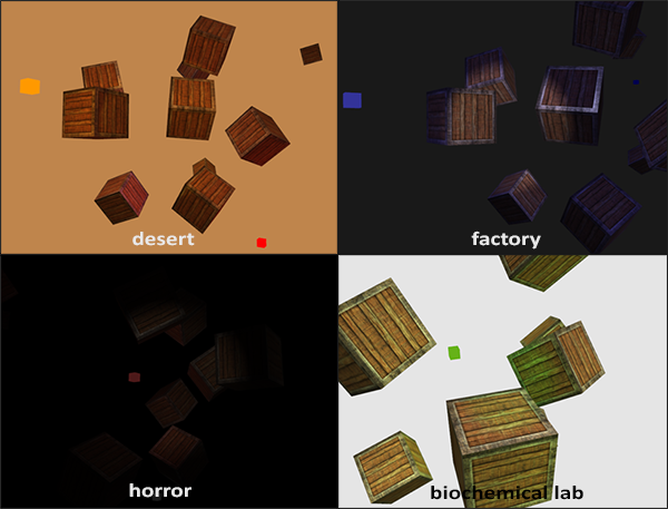 上面图片中的所有光源都是使用上一节中所使用的默认属性,但如果你愿意实验这些数值的话,你能够得到很多有意思的结果。艺术家和关卡设计师通常都在编辑器中不断的调整这些光照参数,保证光照与环境相匹配。在我们刚刚创建的简单光照环境中,你可以简单地调整一下光源的属性,创建很多有意思的视觉效果: