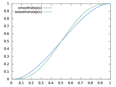 这里我们使用了GLSL的smoothstep函数,它非常光滑地在第一和第二个参数范围内插值了第三个参数。如果深度差因此最终取值在radius之间,它们的值将会光滑地根据下面这个曲线插值在0.0和1.0之间: