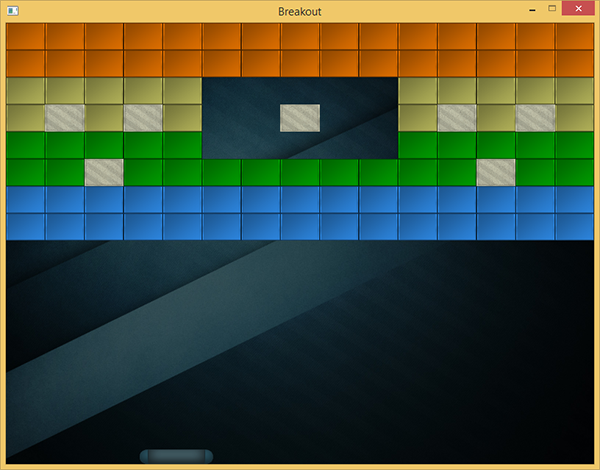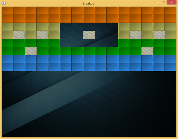 Breakout不会只是一个单一的绿色笑脸,而是一些由许多彩色砖块组成的完整关卡。我们希望这些关卡有以下特性:他们足够灵活以便于支持任意数量的行或列、可以拥有不可摧毁的坚固砖块、支持多种类型的砖块且这些信息被存储在外部文件中。